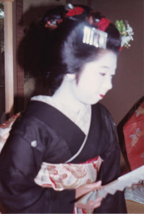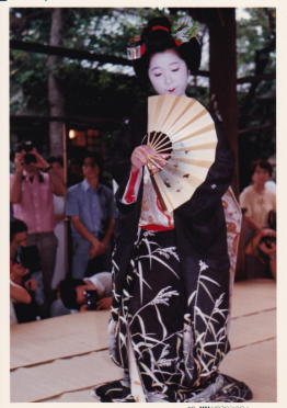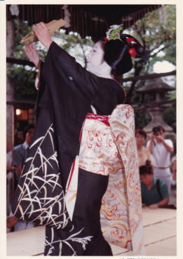 | 「櫛まつり」 使い古した櫛を供養する奉 納時代行列。この髪型は舞妓が芸妓になる ときに結う髪型で先笄(さっこう)とい う。 奉納舞踊「黒髪」を踊りました。 |