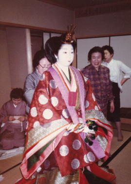 | 十二単着付けショーに出演した時の控室の 写真。 髪型は江戸時代後期(公家) |