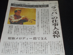 ランペット・ソロのところに叔父の名前が載って いました。テレビにも出て演奏していたので、ト ランペットが上手い人なんだな〜と思っていまし た。 でも自分がカラオケで歌っていたテレサテンの 「空港」が、まさか叔父のトランペットだとは思 いもしませんでした。 京都の高級クラブ「ベラミ」の専属トランペット 奏者をしたり、渡辺プロダクションに属していた ので、有名歌手のレコードの録音に携わった り・・・。でも当時のレコードやCDに叔父の名 前が載ることはなく、吹いてなんぼの世界なので す。 叔父は名前は出なかったけれど、他のプロ演奏者 からは認められていました。「名前なんか出なく てもいい。仲間がみんなわかっているからええん や」と言って亡くなりました。 私は介護の仕事でお金を頂いています。音楽はま ったくの趣味で、好きな歌を唄い、楽しむことが できたことに喜びを感じています。 今、ライブでカズーを吹いている私の姿を天国か ら叔父が見ていたら、転げ回って笑っていること でしょう。 |