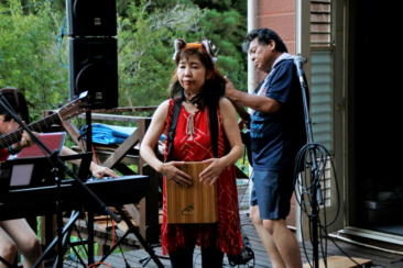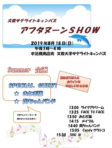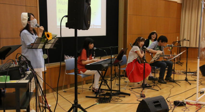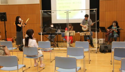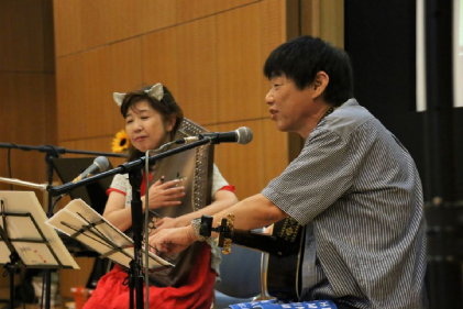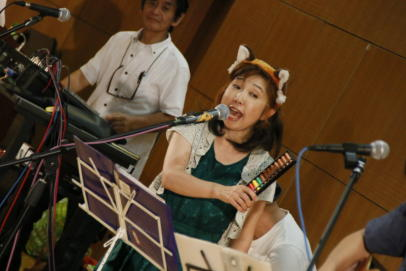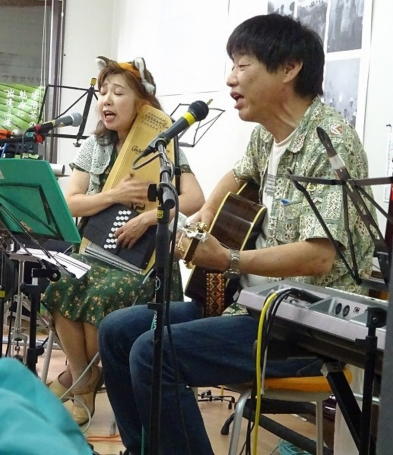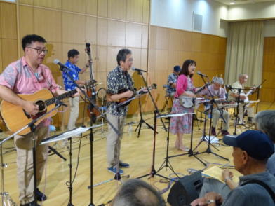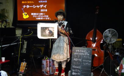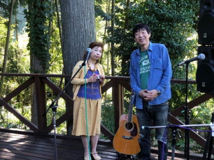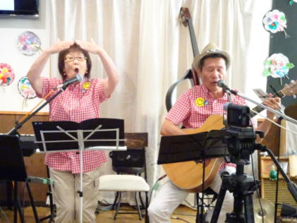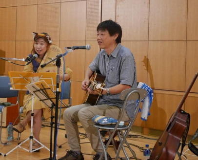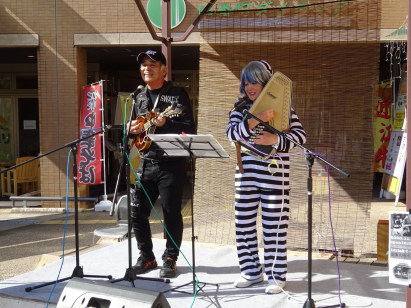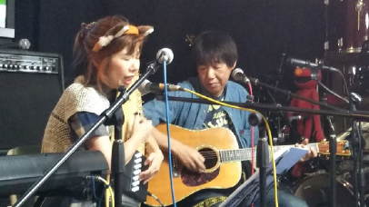 | この日はダブルヘッダーでした。まずは野洲図書館前広場にて森 くま出張ライブに参加。 たこ焼きや唐揚げなどの屋台が立ち並ぶ前でのステージ。暑い日 でしたが、たくさんのお客さんが来て下さいました。 ![]() まずはオープニングで、森くまマスターと共に「陽気に行こう」 「私に人生と言えるものがあるなら」を演奏。HITOMAZzのZENさ んにもギターで加わってもらいました。 ![]() その後「おとぎ猫」のステージ。アウトドアは苦手な二人です が、HITOMAZzの力も借りながら、暑い中を頑張りました。 【演奏曲】 ・テネシーワルツ ・いい日旅立ち ・さらば恋人(with HITOMAZz) ・花嫁(同上) ・東京ブギウギ(同上) ![]() 「花嫁」ではオートハープを置いて、八坂神社の鈴を振りながら 熱唱。 |