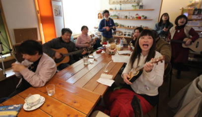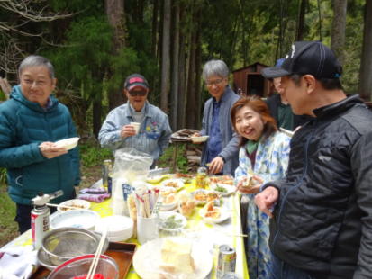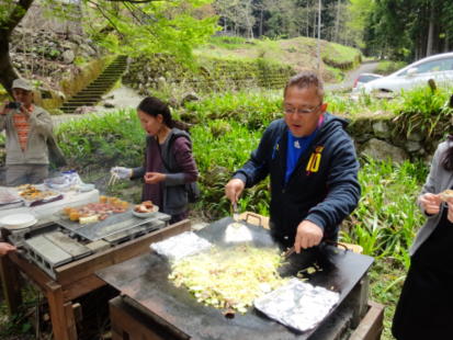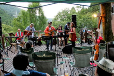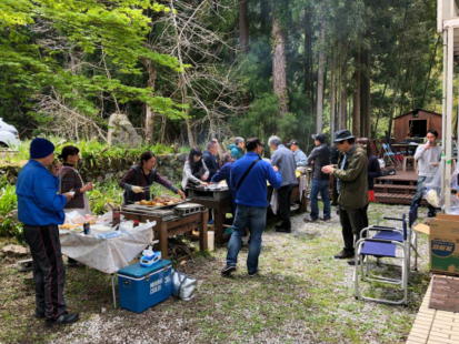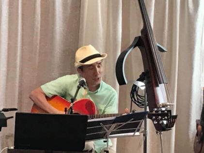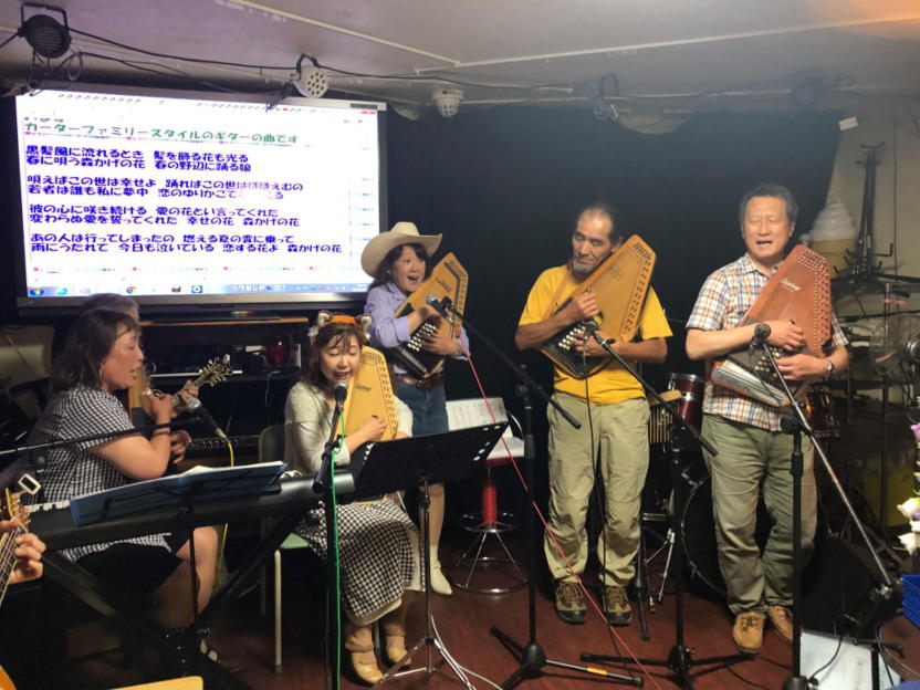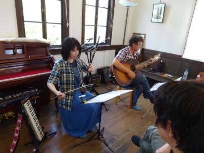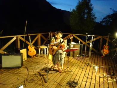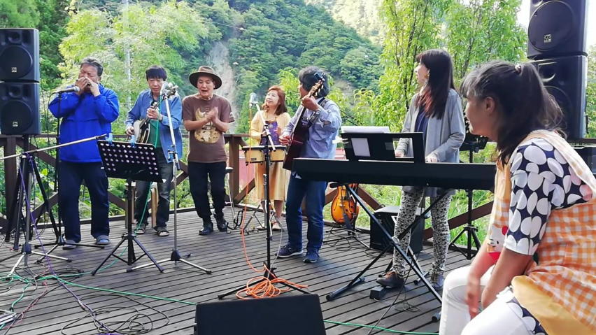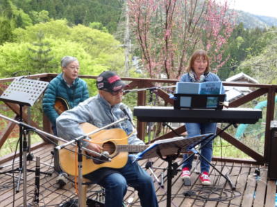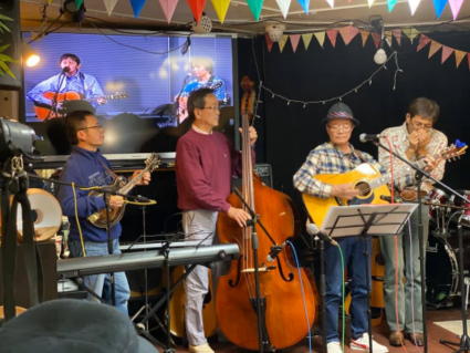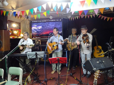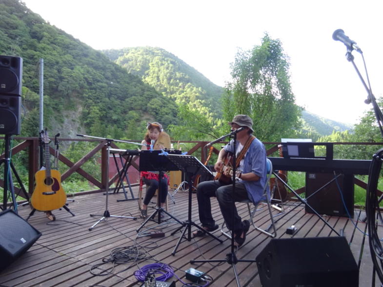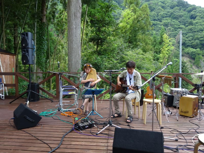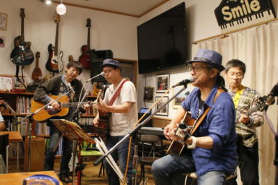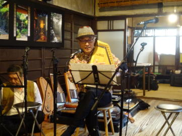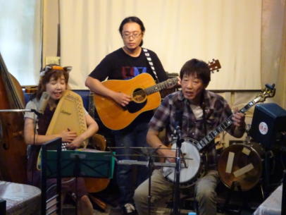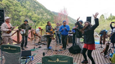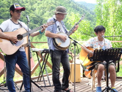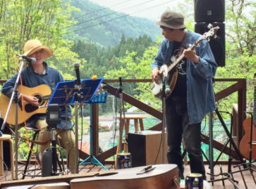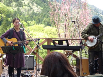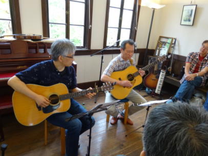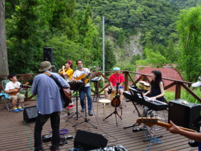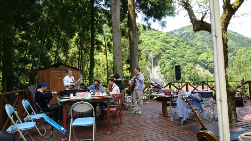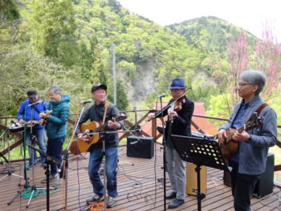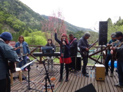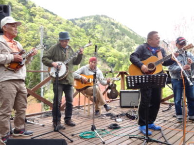 もう何回目になるのかな。大津市葛川の今宮邸にて、ホームパー ティのような和やかなライブに参加させていただきました こんな素敵な風景をバックに演奏させていただくだけでも大満足 です。 日頃から仲良くしてもらっている皆さんと一緒に、食べて、歌っ て、ホントに楽しい一日でした。 今回は大型連休中4回に分けて開催され、この日はカントリー系 バンドの集まり。それぞれ得意の楽器を持って、自由なセッショ ンで大盛り上がりとなりました。 みんなで楽しめる音楽って、ホントにいいですね!