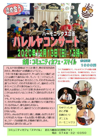 近江八幡市のコミュニティーカフェ・スマイルにて、ハーモニック スさん主催による「ハレルヤ・コンサート」に参加させていただき ました。 「クリスマス」ではなく「ハレルヤ」。今年1年を振り返って、感 謝の気持ちを捧げつつ、互いに認め合い、来年へ繋いでいこうと、 とても素敵な企画です。このようなイベントにお声掛けをいただ き、感謝の気持ちでいっぱいです。 今回はコロナ対策のため、出演者それぞれが事前に動画収録を行 い、それをみんなで鑑賞しようという方式で行われました。 上映会は12月13日。各出演者の動画は、その日にYoutubeで公開され ました。 おとぎ猫は12月3日に動画収録を行いました。以下はそのときの写真 です。 ![]() ![]() 【おとぎ猫 演奏曲】 @十字架に帰ろう A陽気に行こう Bテネシーワルツ C大きな壁が崩れる(We shall overcome 中川五郎さん訳詞) Dまた逢う日まで ![]() Yumiはいつものように、おみやげをいっぱい買いました。 ![]() この日のランチはチキン南蛮。野菜もたっぷりで健康的です。とて も美味しかった。 |