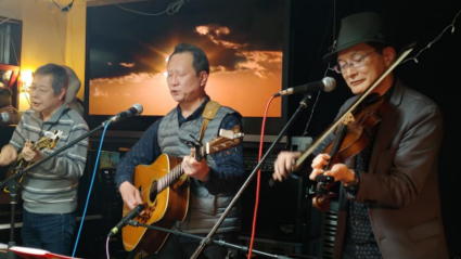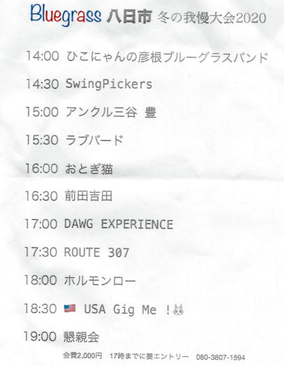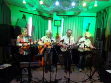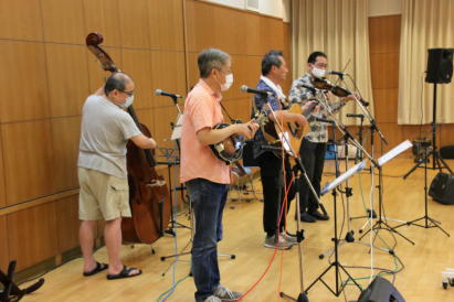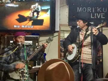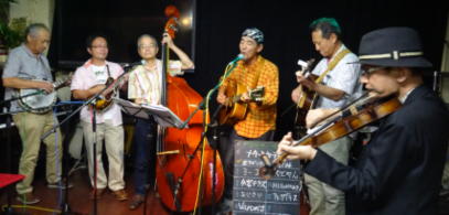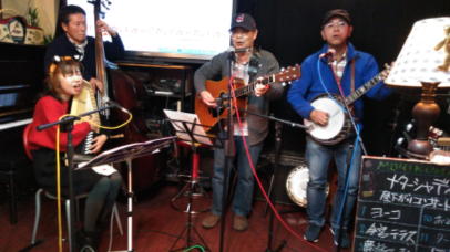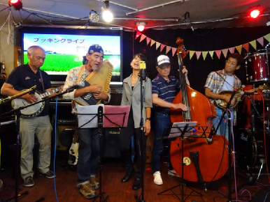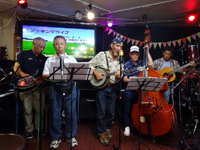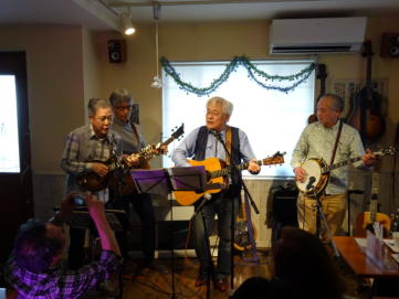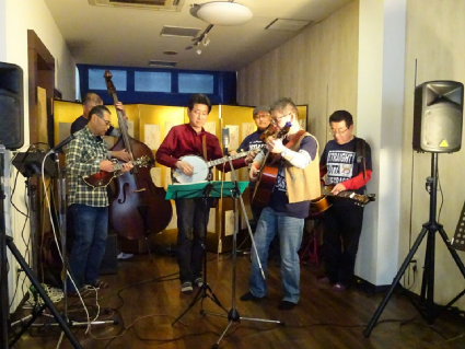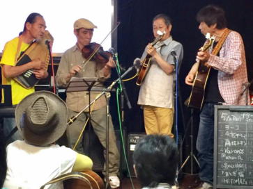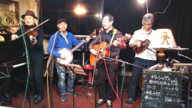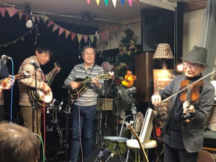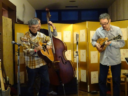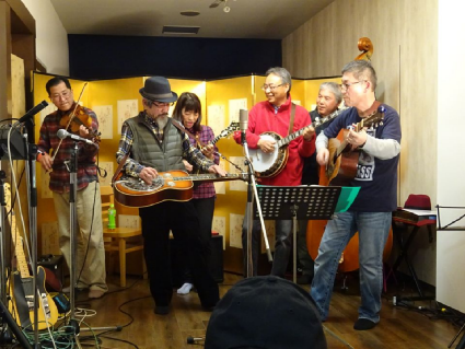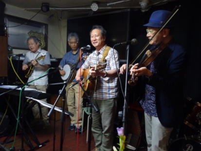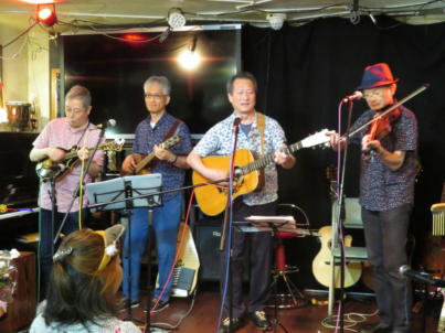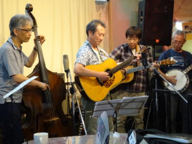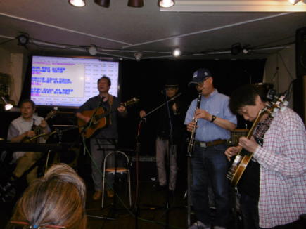 ![]() フォークグラスさん 今回はかなりマニアックな曲を並べて来られました。こちらも欠員1 名ですが、素敵なハーモニーを聴かせてくださいました。 ![]() 浪漫グラスさん 大阪、兵庫から参戦いただきました。こちらも大ベテランの迫力。こ れぞブルーグラス! ![]() この道何十年の大先輩に交って、こちらはこの道2年の若輩者(笑)。 まあそれでも若さと可愛さを武器に(笑)(笑)、なんとか頑張って演奏 してきました。 われわれが若手扱いされてるようではいけないな。ホントに若い人 に、こういう音楽を引き継いでほしいなぁ。 |