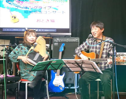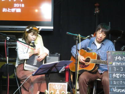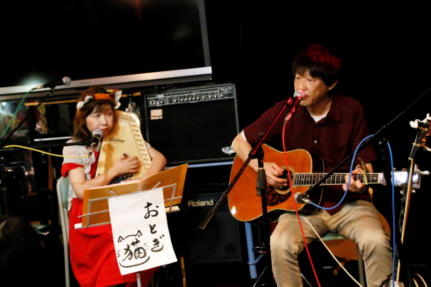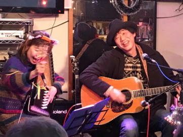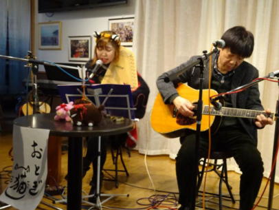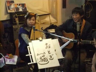 原ファミリーバンドさん主催のパーティーライブに参加させてい ただきました。「ホームパーティーみたいな感じで好きなユニッ トを集めた」とのこと。お声掛けいただき、とても光栄です。 ![]() 音やさんのライブには、先月に続いて2回目の参加。原ファミリ ーさんは10年前からこのお店に出ておられるそうです。ご夫婦ユ ニットですが、結婚前から一緒に音楽をやってられるので、もう キャリアは40年以上。ほんとにすごい! この日 Yumiの衣装は手編みの黒猫柄。なかなか斬新なデザイン です。 ![]() 満面の笑顔。Tokuがこんなに笑うのは珍しい。 いや、ほんとに楽しかったです。 音やさんは音響が良いので、気持ちよく演奏できます。 ![]() 【おとぎ猫演奏曲】 陽のあたる道 ゆきずりの恋 ふしあわせという名の猫 生活の柄 サイド・バイ・サイド ライブ動画 水谷さんがデジカメをじっと手で持って撮って下さいました。 |