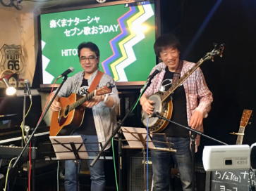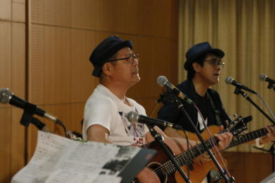 演奏曲は「愛とあなたのために」「心もよう」「戦争はしらない」 「帰ってきたヨッパライ」「太陽がくれた季節」 二人の間に置かれているのは「帰ってきたヨッパライ」に使用する 様々な小道具。 ![]() 今回は鈴だけでなく、ソロバンも振りました。 ![]() トリは HITOMAZz 演奏曲は「花嫁」「二十歳のめぐりあい」「22歳の別れ」「なごり 雪」「イムジン河」「悲しくてやりきれない」「いちご白書をもう一 度」「案山子」 のっけから「みんなで歌おう」の乗り。MCも面白く、会場を大いに 盛り上げてくれました。 ![]() Tokuは久しぶりにHITOMAZzへの復帰。 シングアウトの曲は「遠い世界に」「あの素晴らしい愛をもう一度」 「戦争を知らない子供たち」「心の旅」「岬めぐり」 |