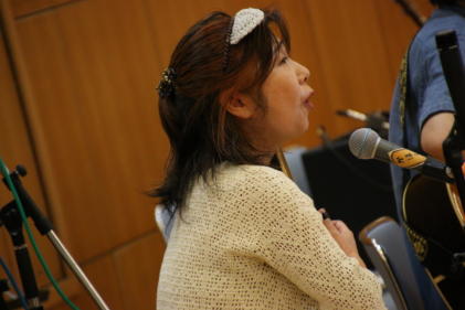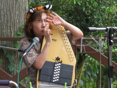![]() 「石狩挽歌」では、カズーでトランペット間奏のフレーズを演奏。 歌の合間のカズーは、けっこうしんどい。 ![]() 「いい日旅立ち」では、とても難しいオートハープ間奏に挑戦。 ![]() 若い頃スペインで買ったというカスタネットを叩きながら、カルメン 風の「勝手にしやがれ」。 ![]() ラストの「東京ブギウギ」では、八坂神社の鈴を振りながら踊りまし た。 ということで、Yumiはとても忙しく、大活躍の一日でした。 終わったら汗だく。でも、充実したライブでした。 |