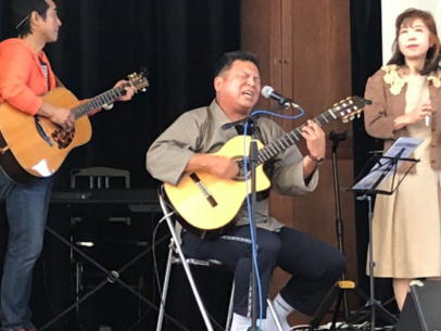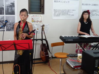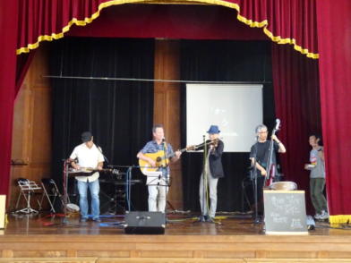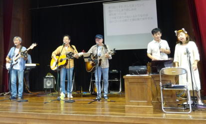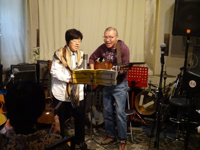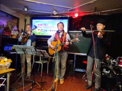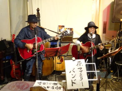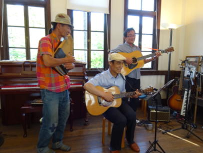 ![]() こんな素敵なステージでやらせてもらう予定だったのですが・・・。 ![]() 夕方から雨が降って来て、室内へ移動。 ![]() 「いい日旅立ち」ではバイオリンに入っていただき、とても気持ちよ く演奏出来ました。 ![]() ライブ終了後も楽しい談話が続きました。 |