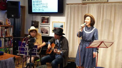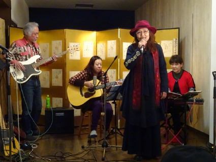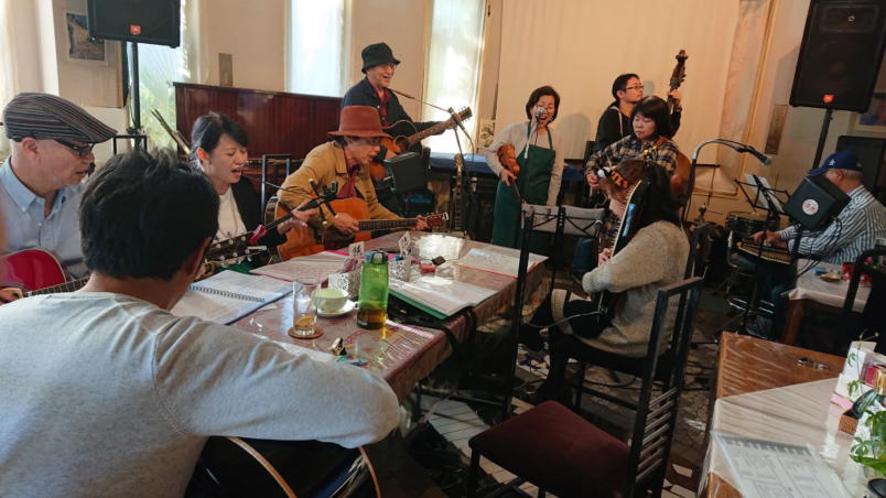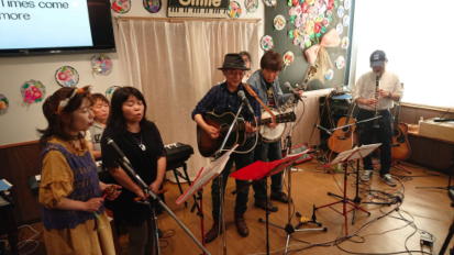 近江八幡市のコミュニティーカフェ・スマイルにて、原ファミリー バンドさん企画「フォークな仲間たち」が開催されました。コロナ 感染症対策として、窓を全開にし、検温・消毒・シールドなど配慮 してのコンサートでした。 原ファミリーバンドさんはこの道40年以上の大ベテラン。その影響 を受けて、おとぎ猫も最近プロテストソングに挑戦するようになり ました。 出演者それぞれに大好きなフォークソングを披露され、みんなで和 気あいあいと、素敵な時間をご一緒させて頂きました。 ![]() まずはお食事から。いつもお腹いっぱい食べます。 腹が減ってはライブは出来ぬ。by Yumi ![]() 【おとぎ猫 演奏曲】 「Hard Days Come Again No More」 (訳詞:おとぎ猫) 「恋人よベッドのそばにおいで」 (訳詞:中川五郎) 「風に吹かれ続けている」 (訳詞:中川五郎) 今回はフォークソングの源流のようなアメリカの歌を、日本語で歌 いました。 ![]() 原ファミリーバンドさん 「悲惨な戦争」「感謝」「光あるうちに」 ![]() ヨーコさん 「心を開いて」「ジョギング・フォー・ユー」「一本の樹」 ![]() みずたにあやさん 「教訓T」「500マイル」「初恋」 |