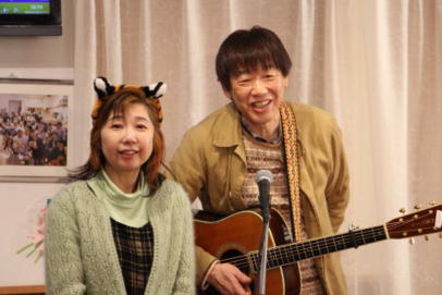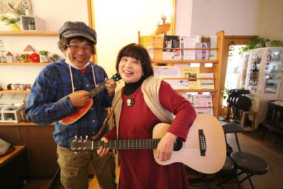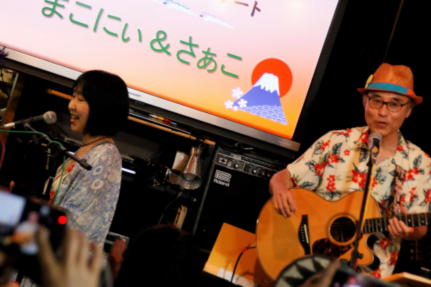 ![]() 8) まこにぃ&さぁこ まこにぃさんソロでの出演も多いのですが、この日はお二人、しか も素敵なペアルックで来てくださいました。仲が良いくせに、いつ も離れた位置で演奏されます。今回は写真うつりのこと等も考慮 し、できるだけ接近するようにとお願いしました。 「22歳の別れ」では、メロディーと伴奏を同時に弾く難しいイント ロ。これにはHITOMAZzの3人(Tokuも含む)度肝を抜かれました。 「まほろば」では「鳥肌が立って泣きそうになった。」これは Yumi、えつこさん共通の感想です。ほんとに素晴らしい演奏でし た。もっと聴きたかった。持ち時間が少なくて申し訳ありませんで した。 ![]() 9) おとぎ猫、第3ステージ またまた登場です。今回はユル〜イ感じで、MCの合間に曲が入る といった構成。「愛とあなたのために」「帰ってきたヨッパライ」 「アタックナンバーワン」をちょっとずつやりました。 そのあと、音楽仲間のオリジナル曲「歌うたいのセレナーデ2」を 演奏。作者のヤブウチさんも会場で聴いてくださって嬉しかったで す。 最後は「いい日旅立ち」。よくやっている曲ですが、今回はフォー クグラス若岡さんによるバイオリン入りの豪華版です。 ![]() 10) 原ファミリーバンド お二人は結婚前からの音楽仲間とのことで、バンドとしてもこの道 40年以上の大ベテラン。おとぎ猫を始めた頃からお目に掛けていた だき、僕たちにとっては師匠のような存在です。 まず1曲目は、おとぎ猫とのセッションでフォスターの「Hard Times, come again no more」。キーが低くてYumiさん大変そう。で も大好きな曲なので頑張りました。あきこ姉さん、いつもこのキー で歌ってるんですか? すごいなぁ。 その後はお二人で「悲惨な戦争」「カントリーロード」を聴かせて くださいました。歌も素敵だし、ギターもよく鳴っている。こんな ふうに上手くハモれるようになりたいです。 ![]() 11) 大江マサキ この日はPA担当で朝からずっとお世話になっている大江さん。満 を持してステージへ登場です。普段から細やかな気遣いをされる方 ですが、今回の選曲がこれまた憎かった。 1曲目はTokuが大好きな加藤和彦さんの「日本の幸福」。以前、大 江さんと二人で「この曲はこちらの録音バージョンのほうがいいよ ねぇ」とマニアックな話をしていたのを覚えて下さってたんです ね。皆さん、こんな曲知らないでしょ? Tokuも加藤さんのレコー ド以外では、今回初めて聴かせていただきました。 2曲目はYumiが好きな「かき氷」。大江さんのオリジナル曲です。 季節感もぴったりだし、これまたギターがすごかった。 そして最後はYumiが登場してコラボ。大江さんがギターとハモのサ ポートをする形で「帰れない二人」を演奏しました。 ![]() 12) HITOMAZz さて、最後のゲストはHITOMAZz。僕にとっては身内みたいなものな んですが、彼らの切れの良いトークと乗りの良いサウンドで盛り上 げてもらおうと、最後に出てもらうことにしました。予想どおり、 客席との掛け合いで喋るわ、笑わせるわ。 演奏曲は「62歳の別れ」というのを予定していたそうですが、まこ にぃさんと被ってしまったため、客席からのリクエストで「花嫁」 に変更。次には事前におとぎ猫がリクエストしていた「落陽」、そ して最後は「リターン・トゥ・パラダイス」となりました。 なんだかんだ言いながら、Tokuも演奏に参加。これほどおとぎ猫の 活動に専念していても、まだメンバー除名にはされてないみたい。 ほんとに有り難いものです。 ![]() 13) おとぎ猫 第4ステージ いよいよラストステージ。Yumiはセーラー服で登場し、HITOMAZzの 演奏をバックに、ソロバンや鈴を振って踊りながら歌いました。曲 目は「セーラー服と機関銃」「太陽がくれた季節」「天使の誘惑」 「東京ブギウギ」。 ラストの「東京ブギウギ」では、ベースに坂本さん、そしてめちゃ ノリノリの踊り子さんに参加してもらって、賑やかな演奏となりま した。その後はフォークグラスの皆さんに演奏参加していただき 「ヘイ・ヘイ・ヘイ」の大合唱。会場の皆さんも一緒に歌ってくだ さり、大盛り上がりの中、コンサートのフィナーレを迎えました。 長時間のライブもようやく終演。いや、まだ続きがありました。 ![]() 終演後は森くまさんのサンドイッチや焼きそばなどを食べながら、 自由なセッションタイム。 おとぎ猫二人は疲れてヘロヘロでしたが、まだまだ元気な人もい て、楽しい演奏を聴かせてくださいました。 ![]() ![]() 最後は「楽しい時はいつでも 過ぎて行くもの」という歌で締め括 りとなりました。 ほんとに楽しかった一日。僕たち二人にとっては生涯忘れることの ない、よい記念となりました。これをひとつの節目とし、今後とも 素敵な音楽仲間たちと一緒に、楽しくやって行きたいと思います。 皆さん、ほんとにありがとうございました。 そして、今後ともよろしくお願いします。 |