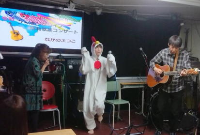 令和の時代になったというのに、平成を飛び越して昭和の時代へ タイムスリップ。 5月5日子供の日ですが、ここは大人の集まり。演者の皆さん、 それぞれの個性を発揮しつつ、ちょっと渋くて多くの人が「懐か しい」と感じるようなナイスな選曲でした。 ![]() 皆さん、それぞれのステージに趣向を凝らされ、常に笑いの絶え ない楽しいコンサートになりました。 ![]() 開演前の つじい亭まいな師匠。 スイカのウクレレを持って漫談の仕込み中です。 ![]() 今回はオープニングアクトで1人1曲の飛び入りコーナー(と言 っても予約制だけど)があり、我らおとぎ猫は、ものすごくテン ションの高いニワトリの伴奏をすることになりました。(笑) なんと、大ウケでした。 彼女はその後も、おとぎ猫のバックダンサーとして大活躍。 ![]() 「みずのね」さん 新婚ご夫婦ユニットです。まだお若いのに、古い曲をよく知って はる。 それぞれが一人でギターを弾いて歌うという場面もあり、そのと き相方は横でじっと見守るという微笑ましいステージでした。 ![]() つじいまいなさん 「あーん、やんなっちゃった」のウクレレ漫談から始まるお笑い ステージ。「シクラメンのかほり」でも笑いを取るというのはす ごいなぁ。 いや、単におもしろいだけではない、その優しく伸びやかな歌声 は、会場の皆さんを魅了していました。 |
