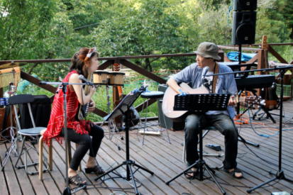 大津市葛川の今宮邸テラスにて野外ライブ。毎回お招きいただ き、ほんとに嬉しいです。おとぎ猫二人は、遠足のような気分で 参加させてもらっています。 暑い日だったけど、下界とは明らかに異なる快適さ。音楽仲間の 皆さんと過ごす、とても楽しい一日でした。 ![]() まずは河原でコンビニのおにぎり。 ![]() 道端でこっそり練習。仲良さそうに見えますが、相変わらずモメ てます。 ![]() また食べてる。今度は焼きそば。 このほかにも、寿司、鮎の串焼き、鶏肉、パンなど、いろんな物 を食べてる写真があるけど割愛します。(笑) ![]() 今宮テラスには、こんな本格的なバーベキュー設備があります。 ![]() ![]() こんな素敵な景色をバックに演奏。とても贅沢! |