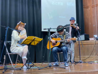 先月に続いてまた野洲図書館ホールに登場。今回は前座ではあり ません。(笑) このコンサートは「野洲市音楽のあるまちづくり実行委員会」主 催によるもので、野洲市および野洲市教育委員会が後援。 今回は仲良しバンド「HITOMAZz」とのツーマンライブとなりまし た。懐かしい昭和歌謡やフォークソングをいっぱい歌わせていた だきました。 ![]() 朝の準備時間から手伝いに来て下さった方、差し入れを持ってき て下さった方などもおられて嬉しかったです。 音響設備とPA担当は、ライブ喫茶「森のくまさん」の上田マス ター。お店そっちのけでの応援、ありがとうございました。 ![]() 〇第1部 おとぎ猫 歌謡曲を中心に、フォークソング、アニメソング、昭和ジャズなども取り入れ て演奏。最後の3曲では、HITOMAZzのサポートをいただきました。 【演奏曲】 ・花の首飾り ・テネシーワルツ ・石狩挽歌 ・虹をわたって〜ひなげしの花 ・いい日旅立ち ・遠い世界に ・アルプスの少女ハイジ〜アタックナンバーワン ・月光値千金〜上海リル〜リンゴの木の下で ・天使の誘惑 ・東京ブギウギ ・(アンコール)私の彼は左きき ![]() 来客者数は158名。会場はぎっしり満員となりました。 皆さんが一緒に歌って下さり、大いに盛り上がりました。 |