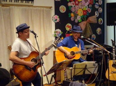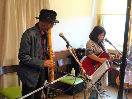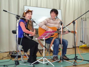 ![]() 「こもれび」さん 枚方市から来て下さいました。 ハイテクニックなギター、ブルースハープと澄んだ歌声。とて も素敵でした。 ![]() つじいまいなさん&サポートのZENさん 新たな漫才コンビ結成か?(笑) ![]() 「ポップス合唱団」さん カーペンターズなど、みんながよく知っている曲を演奏されま した。6人ボーカルはすごい。 ![]() トリは「HITOMAZz」さん 安定感のある演奏とお笑いMCで、スマイルでの人気も急上昇 中。最後には御大がカホンで参加され、豪華な演奏となりまし た。 |