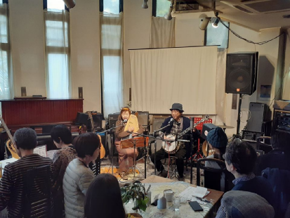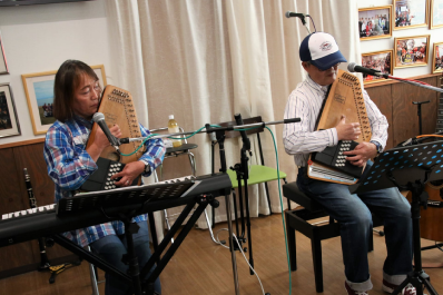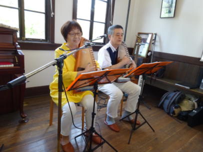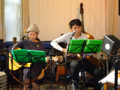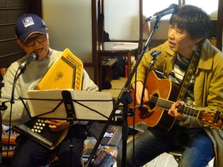 | ダブルヘッダー2本目。午後からは旧水口図書館へ。ヴォーリズ 建築のとても素敵な会場でした。 この日は、広島へ引っ越される「どらわこさん」のお別れ会を兼 ねたイベント。どらわこさんにはオートハープのことをいろいろ と教えていただき、とても感謝しています。 ![]() ![]() 主催者の「やどやん」は、ギター、フィドル、オートハープ、マ ンドリンと大活躍。 ![]() 初めてお会いしたケールユニットさん。 多彩な楽器を駆使し、またギターやハーモニーも素晴らしかっ た。同じ男女二人組で、しかも夫婦でないお友達ユニット。親近 感を感じます。 ![]() フォークグラスさんは3名欠席のため、こんな珍しい楽器編成 に。平尾さんはフィドルも披露されました。 |