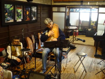 嵐山の「音や」にて、坂庭寛悟さんが以前やっておられたお店 「ほっこり弟国」の再現。1年に1度の催しで、この日は寛悟さ んが1日店長です。 そんな大切なライブにお声掛けをいただき、大喜びで参加させて いただきました。 ![]() ![]() 嵐山紅葉見物で、向かいの道は大渋滞。それを見越して朝早くか ら出発し早くに着いたので、駐車場で練習中。 ![]() 8組のブッキングと、その合間にセッションタイム。約8時間に 及ぶ長丁場となりましたが、最後までたっぷり楽しませていただ きました。 ![]() 【おとぎ猫 演奏曲】 ・今宵恋に泣く ・石狩挽歌」 ・サイド・バイ・サイド (クラリネット:寛悟さん) ・いい日旅立ち (バイオリン:若岡さん) ・リターン・トゥ・パラダイス (サポート:フォークグラスさん、河林さん) ![]() Yumiは、フォークグラスのゲストボーカルとしても出演しまし た。歌ったのは「別れの恋唄」。 ![]() セッションタイムでは、フォークグラスと合同で「キャットグラ ス」として、またまた出演。 演奏曲:「柳の木の下」「天国の岸辺」「サンフランシスコ・ベ イ・ブルース」 |