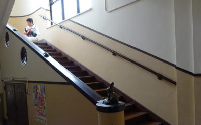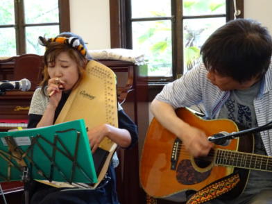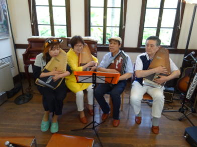 ![]() オートハープ4台による演奏。Yumiのスリッパだけ色が違うの は、間違えてトイレのスリッパを履いてきたため。(笑) ![]() おとぎ猫の前に、またもや浮気ユニット「よその猫」。 ![]() 出演順は厳正なるくじ引きの結果、おとぎ猫はなんと大トリ。 どらわこさんご夫妻の新しい門出を祝って「陽のあたる道」 「いい日旅立ち」「私の青空」を演奏させていただきました。 ![]() 「私の青空」では、カズーでトランペット風の間奏と後奏。こ れが意外とウケて、アンコールまでいただきました。 全部で15組の出演となりましたが、和気あいあいとした楽しい コンサートでした。 旧水口図書館はレトロな雰囲気で、ほんとに素敵な会場でし た。機会があれば、ぜひまた参加したいです。 どらわこさん、広島でのご活躍をお祈りいたします。 |
