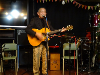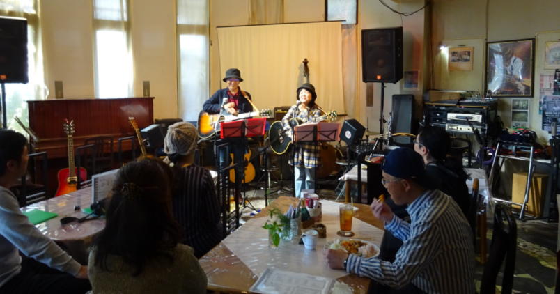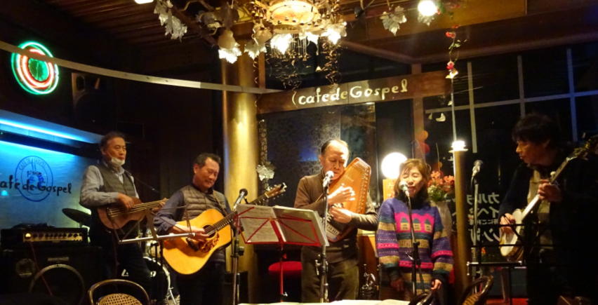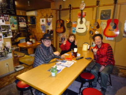 京都市伏見区にあるカフェ・ド・ゴスペルの「カントリー&フォ ークライブ」に、初めて参加させていただきました。 京都フォーク界の大御所、小川様から声を掛けていただき、緊張 しながらお店へ向かったのですが、行ってみればよく知った人が たくさんおられてビックリ。一気に緊張がほぐれ、気楽に楽しむ ことができました。 ![]() 「音楽は魂のラブレター」と書いてある。いい言葉ですね。 カヴァー曲を演奏するわれわれは、ラブレターを運ぶ郵便配達員 のような役割かも。 ![]() ベテラン勢が早くから来られて、練習をされていました。 店内は意外と広く、良い雰囲気です。 ![]() 【おとぎ猫】演奏曲 @ 今宵恋に泣く A テネシーワルツ B サイド・バイ・サイド C 陽気に行こう 初めての参加なので、無難なセットリストにしました。 ![]() ![]() 主催者の小川さんと。 とてもダンディーで、気さくな方でした。たくさんお話をしまし た。 この音楽会は、偶数月の第2土曜日の夜に定例で開催されている とのこと。 ゆったりした空間で、素敵な大人の音楽。 できれば次回も参加したいと思いました。 |