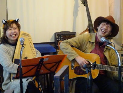 | 森くま恒例のナターシャデー。おとぎ猫はこのところ毎 回参加しています。 今回の出演者は、(敬称略) ヨーコ 今宮テラス 藤村マーチン Varon's 明日の風 宿やんと仲間たち おとぎ猫 HITOMAZz フォークグラス 坂庭寛悟バンド それぞれが個性を出し合いながら得意曲を披露したり、 セッションをしたりと、楽しいひと時を過ごしました。 ![]() Yumiは、今宮さんの「十字架に帰ろう」にカズーで参 加。 ![]() Tokuは「おとぎ猫」「HITOMAZz」の2バンド掛け持ち。 ZENさんと二人で演奏していると、高校生時代に戻ったよ うな気分です。 【HITOMAZz演奏曲】 ・森かげの花 ・すずめの唄 ・ふるさとの風 ![]() こんなセッションにも参加してます。 ![]() Yumiがオートハープを始めたのは、坂庭寛悟さんに勧め られたことがきっかけ。 大好きな寛悟さんとツーショット!と思ったら、後ろに 邪魔者が写ってる。(笑) |