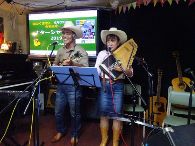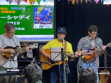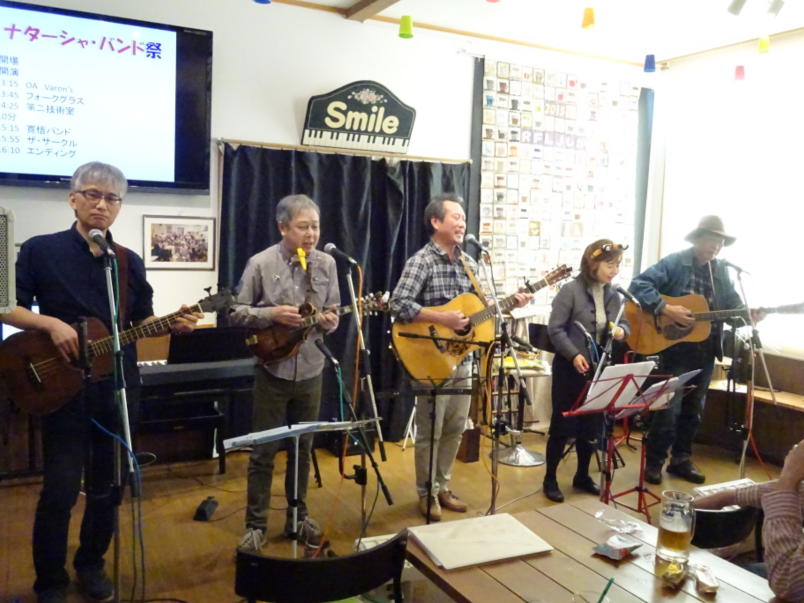 今回おとぎ猫2名は、「フォークグラス」の臨時メンバーとして 参加。大好きなバンドに入れてもらって光栄でしたが、普段とは 違った緊張感もあり、とても良い経験をさせていただきました。 スマイルのナターシャバンド祭は、今年で3回目。第1回は観客 として参加、第2回はオープニングアクトとして出演しました。 ナターシャセブンの楽曲を専門的に演奏されるバンドが集まると いうマニアックな催しです。 ![]() ホストバンドのフォークグラスですが、フィドルの若岡さんとバ ンジョー&ドブロギターの平井さんが欠席ということになり、代 わりにわれわれ2名が入ることになりました。 お声掛けをいただき、ありがとうございました。 ![]() Tokuはギター、ロングネックバンジョー、コーラス。 Yumiはオートハープ、カズー、ボーカル、コーラス。 今回は「お手伝い」に徹して頑張りました。 ![]() 【フォークグラス演奏曲】 別れの恋唄T どこにいればいいんだろう サイド・バイ・サイド 天国の岸辺 すずめの歌 サンフランシスコ・ベイ・ブルース ライブ動画 |