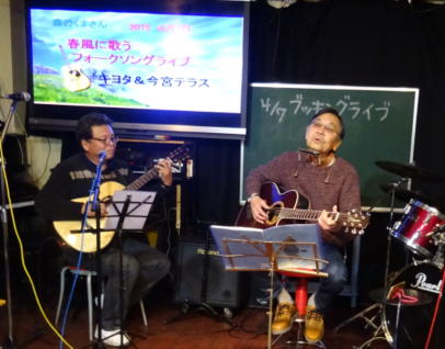 滋賀県でもようやく桜が満開となったこの日、「春風に歌う」と 題したコンサートに参加させていただきました。 Yumiにとっては久しぶりの「森くま」。 Tokuはその間「HITOMAZz」「よその猫」「はぐれ猫」などで出て いましたが、ホンモノのおとぎ猫は久しぶりです。 ![]() さて、春らしい歌を!と、いろいろと考えた結果、次のようなセ ットリストになりました。 【おとぎ猫】演奏曲 @ 私を待つ人がいる A なごり雪 B 赤色エレジー C あした天気になあれ D 不思議なピーチパイ 「なごり雪は春の曲ですよー」と、まず釈明してから演奏。 つい数日前には雪が降ったばかりで、ちょうどタイムリーな選曲 となりました。 ![]() AとBでは、フォークグラスの若岡さんにバイオリンを弾いてい ただきました。 特に「赤色エレジー」では、物悲しいバイオリンの音色が効果を 発揮したかと思います。 ![]() 一転して、ウキウキ気分で「不思議なピーチパイ」。皆様の手拍 子をいただき、気持よく演奏出来ました。 ![]() |