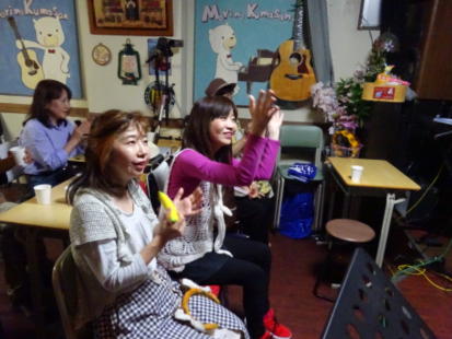 ![]() ![]() ![]() 今回は「おとぎ猫」と「Cocoro」のメンバー入れ替えによる新 ユニット演奏を披露しました。 まずは Yumi & Kazumi による「エンドレス・レイン」。 ![]() 二人ともXJAPANが大好きなんですが、相方の同意が得られず演 奏させてもらえません。そうした日頃のうっぷんをぶつけるよ うな熱演でした。 ![]() Toku & Miyakoでは「桃色吐息」。こちらは、あぶれた者同士 で何かやるか、といった感じ。(笑) |