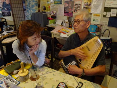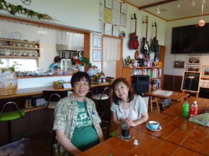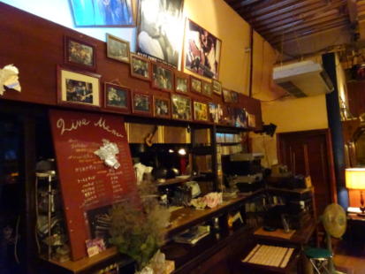 カフェ・ド・ゴスペル(京都市伏見区)のカントリー&フォーク ライブに参加しました。今回で2回目です。 まるでナイトクラブのような雰囲気の中、カントリーあり、フォ ークあり、ジャズありで、大人の音楽会を楽しませていただきま した。 このお店はとても雰囲気がよくて、二人とも大好きです。 しかし、エアコンがなく、夏場はライブ休止だそうです。秋にな ったら、また参加させていただくことを楽しみにしています。 ![]() おとぎ猫、演奏曲は ・ゆきずりの恋 ・カーターファミリーメドレー ・ふしあわせという名の猫 ・プカプカ ![]() 主催者の小川さんからオートハープのレクチャーを受けるYumi。 小川さんは若いころ高石ともやさんと一緒に車に乗って中津川の フィールドフォークに行ったというお方。 ギターだけでなくオートハープもお上手です。さすがに歴史を感 じます。 ![]() 開演前、マスターご自慢の完熟トマトを差し入れにいただきまし た。 ![]() このお店は、インテリアがとても素敵です。 ムクの木を贅沢に使用した壁面にもマスターのこだわりが感じら れます。 ![]() こんなのも置いてあって、Tokuは大喜び。 |
