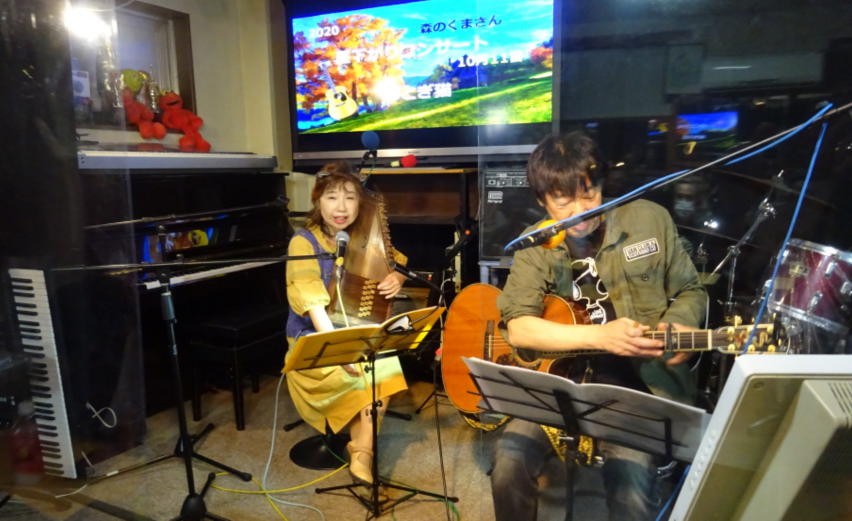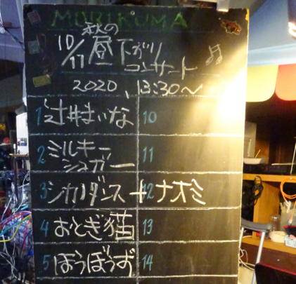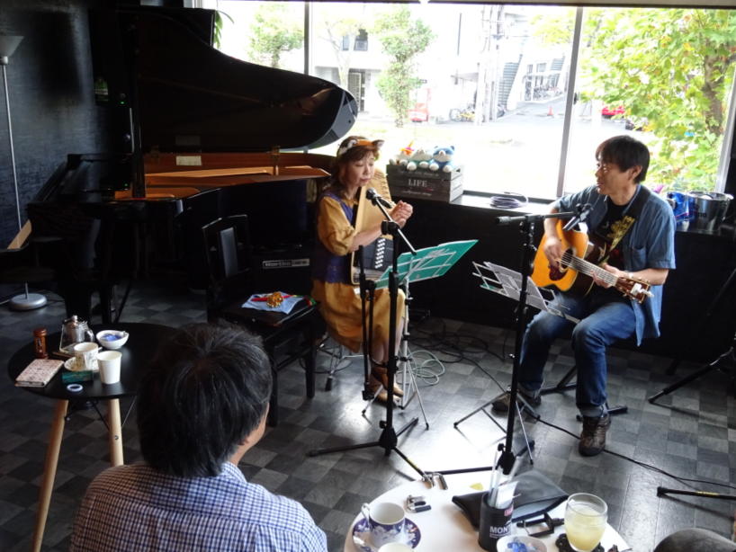 われわれのホームグラウンド「ライブカフェ・森のくまさん」にて 秋の昼下がりブッキングライブが開催されました。 こんな時期なので出演者だけかと思っていたのですが… たくさんのお客様でびっくりしました。 コロナ自粛で半年以上もお会いできていないお客様方にも再会する ことができました。 台風も過ぎゆき、爽やかな秋晴れの午後のひと時を、音楽を通じて 出会った方々とご一緒できましたことを嬉しく思います。 ![]() 今回は5組の出演。個性豊かなメンバーです。 ![]() つじいまいなさん いつもほのぼのとしたお人柄の楽しいステージです。 ![]() ミルキーシュガーさん PPMの歌を中心に英語で歌われました。 |