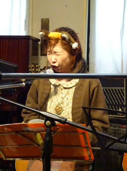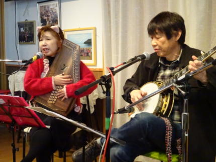 この日は雪が心配されたけど、交通には支障なく、午後にはすっ かり融けてました。今回もナターシャセブン好きな人たちが集ま り、みんなで楽しい時間を過ごすことができました。 今回おとぎ猫はベースの野口さんをサポーターにお迎えし、3人 編成で参加。3人全員が猪年の年男・年女というお目出たいユニ ットです。安定感のあるベースの音に支えられ、気持ちよく演奏 することができました。 ![]() ![]() ![]() 【おとぎ猫演奏曲】 @ ダイヤの指輪(Gold Watch and Chain) A ナイン・ポンド・ハンマー(替え歌) B 陽気に行こう ナイン・ポンド・ハンマーは、アメリカの線路工夫の重労働を歌 った曲なんですが、これをYumiの辛い仕事になぞらえて替え歌に してみました。 「♪ 朝のお迎え 年寄り乗せて 車椅子 重すぎる」「家を出 て 介護の仕事 給料安い つらすぎる〜」 訪問介護の仕事をされているY子さんが客席でクスクスと笑って おられるのが印象的でした。 ![]() Tokuは、みずたにあやさんのサポートでギターとバンジョーを弾 きました。相方の目前。もはやこれは浮気ユニットとも言わない ですね。(笑) ![]() Yumiはオートハープ&コーラスで参加。 いきなり指名されて人のサポートをするなんて、成長したもん だ。 |
