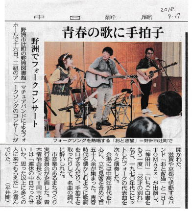![]() 〇第2部 HITOMAZz かぐや姫、吉田拓郎など、フォークソングを中心に演奏。 相変わらず面白いMCとハイテクニックな演奏で、会場を沸かせました。 やっぱり上手いねぇ。 ![]() 〇第3部 みんなで歌おうフォークソング 出演者全員がステージに上がり、PA担当の上田マスターも演 奏に参加。会場の皆さんと一緒に大合唱となりました。 【演奏曲】 ・風 ・翼をください ・心の旅 ・戦争を知らない子供たち ・(アンコール)あの素晴らしい愛をもう一度 ![]() コンサートの模様は、翌日の中日新聞に掲載されました。 記事に記載されている曲名はすべてHITOMAZzが演奏したもので すが、写真はなぜかおとぎ猫。 おとぎ猫にとっては初めての長時間コンサート。素敵な会場で たくさんのお客様に聴いていただき、とても良い経験となりま した。 またこういった企画にお呼びが掛かるよう、精進していきたい と思います。 |