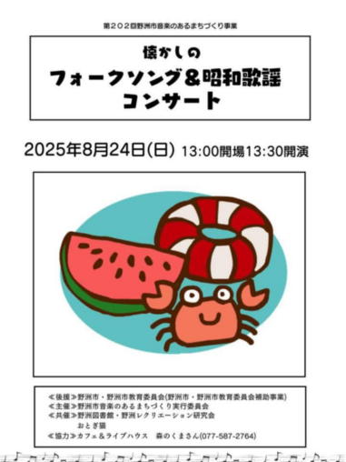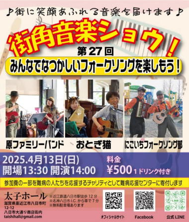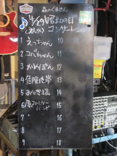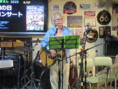 | 2025年4月29日(祝日) 滋賀県野洲市にある「森のくまさん」にて「昭和の日コンサ ート」に参加させていただきました。 今年は昭和100年。 そういえば僕らが子供の頃、明治100年という年がありまし た。明治なんてずいぶん昔のことだと思っていたけど、今の 子供たちは、それと同じような感覚で昭和の風景を想像して いるのかもしれません。 昭和は遠くに去りにけり。 そんなことを想いながら、昭和の歌謡曲を演奏しました。今 回は普段やっているフォークソングなどは封印しました。や っぱり昭和と言えば歌謡曲ですよね。 レトロな佇まいの「森のくまさん」で、昭和の思い出にどっ ぷり浸かりました。 他の出演者の演奏は素晴らしく、いろんな曲が聴けてとても 楽しい一日でした。 【おとぎ猫の演奏曲】 ・虹をわたって (天地真理) ・時の流れに身をまかせ (テレサ・テン) ・いい日旅立ち (山口百恵) ・さらば恋人 (堺正章) ・石狩挽歌 (北原ミレイ) ![]() ![]() ![]() 練習が終わって楽しいランチタイム ![]() 開演前に、ファイト一発! |