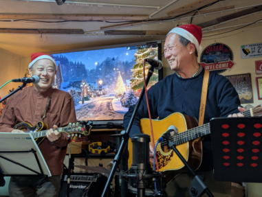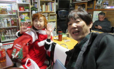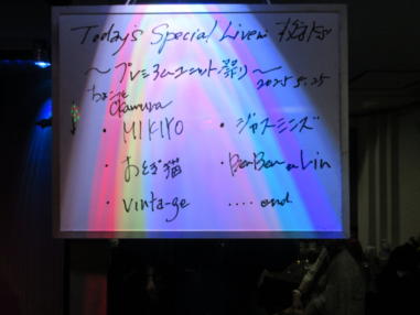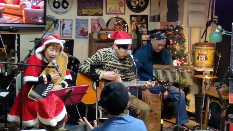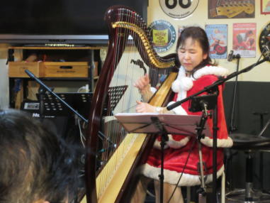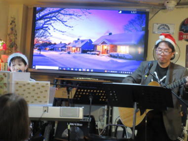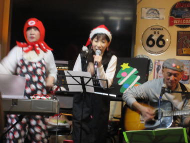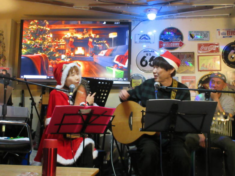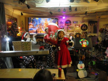 | 滋賀県野洲市にあるライブカフェ・森のくまさんにて… クリスマスコンサートが開催されました。 おとぎ猫はホストバンドで参加させて戴きました。 去年はYumiがインフルエンザになってしまい参加を断念しま したが、今年は皆さんと過ごせたことがとても幸せです。 それぞれの想いの詰まったクリスマス…? いろいろなことがあった1年でしたが、音楽で出会った方々 と心温まるひと時を、大好きな森のくまさんで過ごせたこと に感謝致します。 また来年も健康で皆様とご一緒できることを楽しみにしてお ります。 ![]() 今回は、しんちゃんにパーカッションのサポートをいただ き、3人で演奏しました。 【おとぎ猫の演奏曲】 @サンタが街にやって来る A十字架に帰ろう Bあこがれの北新地 Cプカプカ Dイマジン(おとぎ猫訳詞) ![]() ![]() 原ファミリーさんご提供のノンアルコールワインで乾杯をし ました。 ![]() |
