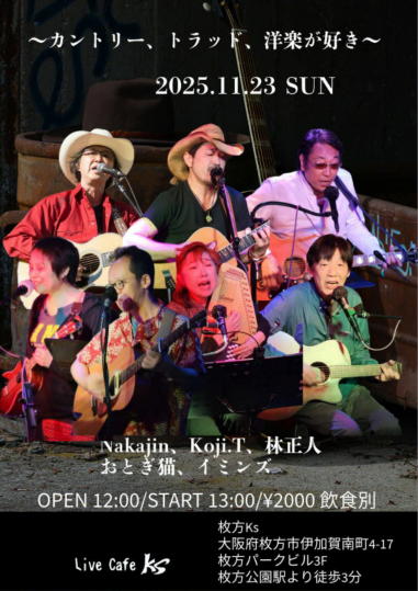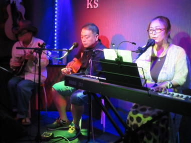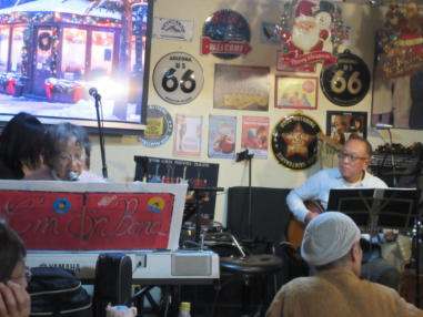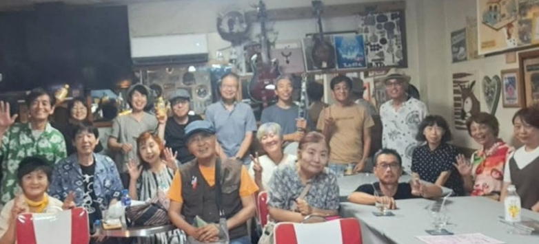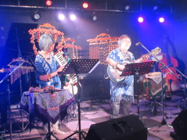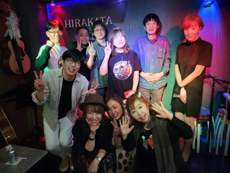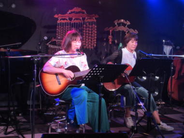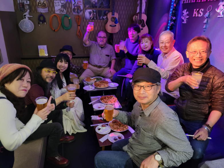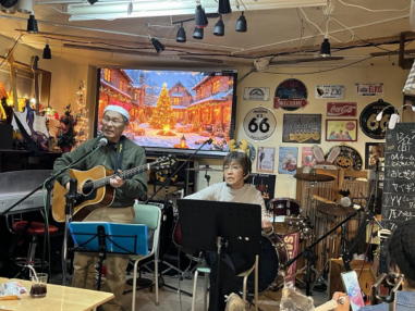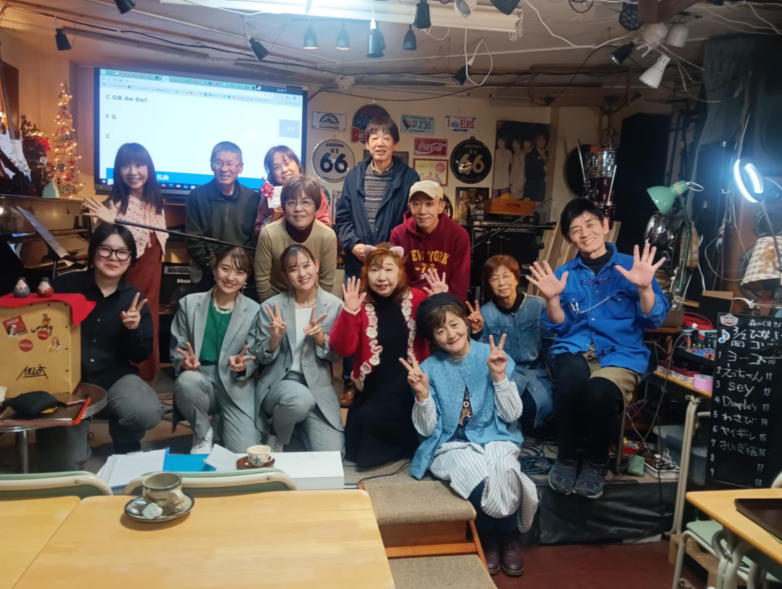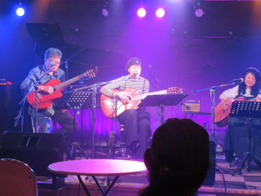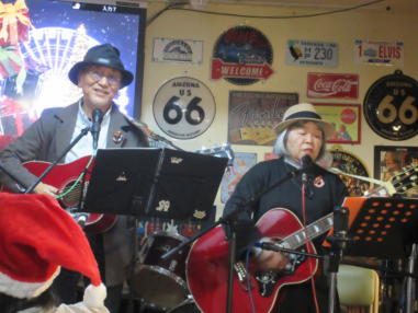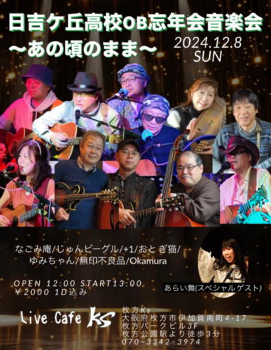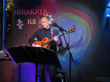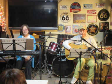 | 枚方パーク向いにあるLive Cafe Ksさんにて… 日吉ヶ丘高校OB忘年会音楽会 〜あの頃のまま〜に出演させて戴きました。 こんなに素敵な楽しいライブにお誘いくださったフォークグ ラスの五十嵐さんに感謝します。 高校生当時は音楽をやっていなかった私ですが… 美術工芸科の1年先輩のあらい舞さんと47年ぶりに再会し、 一緒にライブに出られるなんて夢のようです。 これからも音楽が導いてくれた素敵な方々と交流を深め、人 生を豊かに生きて行きたいと思います。 出演者の皆さん、枚方Ks店長の岡村さん、写真を送って戴い た方々、本当にありがとうございました。 今後とも宜しくお願い致します。(文責:yumi) ![]() 【おとぎ猫の演奏曲】 @今宵恋に泣く A虹をわたって B上海バンスキン・メドレー Cガンダーラ Dイマジン(おとぎ猫訳詞) ![]() ![]() ![]() ![]() |