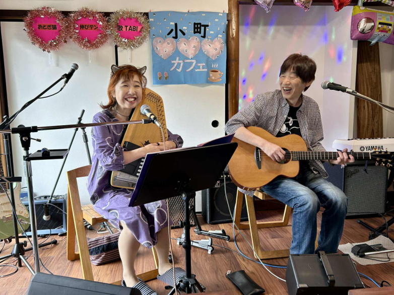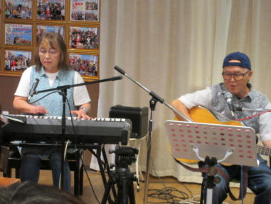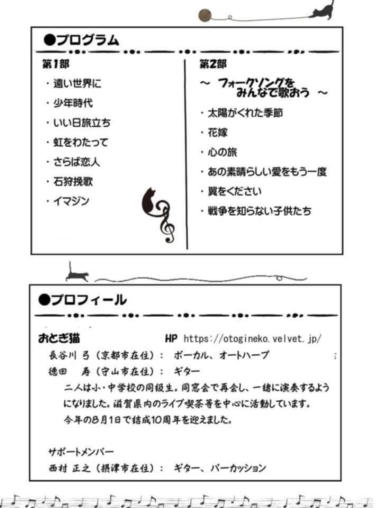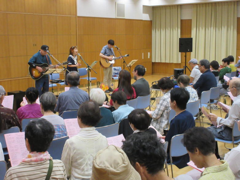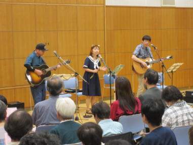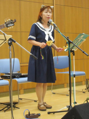 | 滋賀県野洲市にある野洲図書館ホールにて 第202回野洲市音楽のあるまちづくり事業。 「懐かしのフォークソング&昭和歌謡コンサート」に出演さ せて頂きました。 おとぎ猫のサポートにはHITOMAZzのまぁ君をお迎えして、3 人で演奏しました。 猛暑の中、100人を超えるお客様にお越し頂き嬉しく思いま す。 第2部の「みんなで歌おう」では、会場全体が歌声に包ま れ、お客様と共に大いに盛り上がることができました。 このように素敵な会場で演奏させていただき、おとぎ猫10 周年の良い記念になりました。 これからも皆様に愛されるバンドを目指して、活動して参り たいと思います。 ![]() 主催者代表、青木さんの開会あいさつ。 ![]() 第1部は、いつものように二人で演奏。 ![]() 途中からカホンのサポートに入ってもらいました。 ![]() 第2部は、3人で立って演奏。Yumiはセーラー服姿です。 ![]() ![]() ![]() |