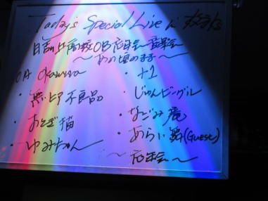 | 京都市西大路五条にあるLive cafe WEST5さんへ初めてお邪 魔しました。いつもお世話になっている滝井さんと五十嵐さ んによる企画ブッキングライブです。 こじんまりとしていますが、音響がよく、マスターご夫妻も 親切な方で、素敵なお店でした。 出演者は顔なじみの方ばかりで、和気あいあいとした雰囲気 の中、楽しい時間を過ごさせていただきました。 主催者の滝井さんをはじめ、お世話になった皆さま、ありが とうございました ![]() 【おとぎ猫演奏曲】 @ あした天気になぁれ A サルビアの花 B 石狩挽歌 C 綿つみの歌 D イマジン(おとぎ猫訳詞) ![]() ![]() |
