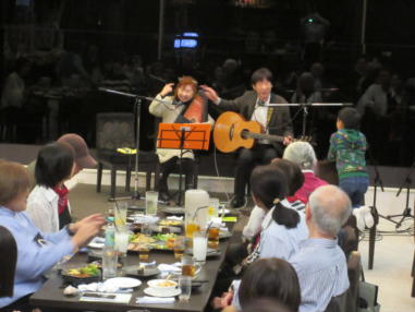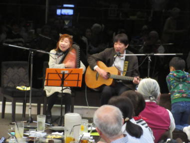 滋賀県東近江市にある太子ホールにて… 今宮テラスさん主催のコンサート。 「しっかりやりましょ時間まで」が開催されました。 只今改装工事中の今宮さんのテラスには思い出がいっぱいで す。 音楽仲間との出会い。 四季折々の自然の中で歌い食べた思い出は今でも忘れること はできません。 そして太子ホールで仲間の輪がまた広がって行きました。 今宮さんの人徳と包容力は人と人を繋げる力があります。 素晴らしい音響の太子ホールで皆さんの演奏を聴けたこと、 歌えたことに感謝致します。 ![]() 【おとぎ猫の演奏曲】 @ カーターファミリーメドレー A だれかが風の中で B 石狩挽歌 C 青春の影 ![]() 出番前にファイト一発! ![]() ![]() スパゲッティやおぜんざいが振る舞われました。 ![]() レディースゴールドさん ![]() キッシーさん ![]() ウッドペッカーさん |
